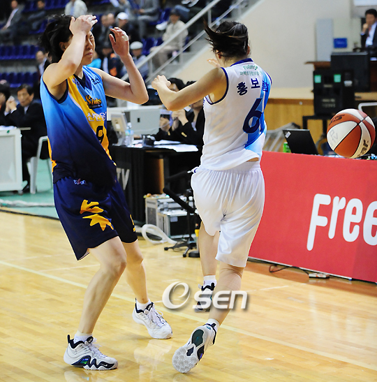 '2008-2009 KB국민은행 여자프로농구' 용인 삼성생명과 안산 신한은행의 경기가 13일 경기도 용인실내체육관에서 열렸다. 이 날 경기에서 신한은행은 삼성생명과의 접전 끝에 진미정(19점)과 하은주(16점 8리바운드)의 활약에 힘입어 61-58로 승리를 거뒀다. 이로써 신한은행은 3승 1패를 기록하며 이날 경기가 없었던 금호생명과 신세계를 제치고 단독 선두로 올라섰다. 경기 종료가 얼마 남지 않은 상태에서 신한은행 정선민이 볼을 받으려다 삼성생명 홍보람과 부딪쳐 통증을 호소하고 있다./용인=민경훈 기자 rumi@osen.co.kr