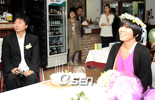 강원래-김송 부부가 지난 12일 서울 홍대 인근의 한 이탈리아 음식점에서 결혼 5년을 기념하는 깜짝 파티를 열었다. 이날 파티에서 강원래는 아내 몰래 영상편지를 준비하는가 하면 둘의 사연이 담긴 나무자전거의 신작 뮤직비디오 ‘내가 사랑해’를 틀어주며 사랑과 감사의 마음을 전했다. 나무자전거의 ‘내가 사랑해’ 뮤직비디오는 김송이 쓴 ‘장미를 사랑한 선인장’이라는 책 내용을 바탕으로 만화가 김준희 씨의 그림과 나무자전거의 노래가 덧입혀져 탄생됐다. 김송이 자신들의 이야기를 담은 나무자전거의 뮤직비디오를 보며 환하게 웃고 있다. /강희수 기자 100c@osen.co.kr