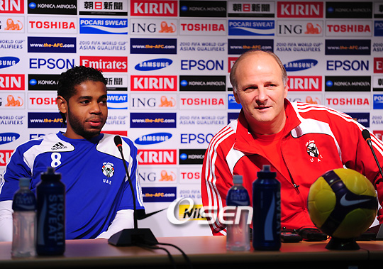 아랍에미리트연합이 오는 15일 한국과 2010 남아프리카공화국 월드컵축구 아시아지역 최종예선 2차전을 앞두고 14일 저녁 서울월드컵경기장에서 훈련을 가졌다. 프랑스 출신인 도미니크 바트네 감독이 기자회견에 앞서 불어 통역자가 도착하지 않아 인터뷰가 지연되자 당혹스러운 표정으로 취재진을 바라보고 있다./상암=김영민 기자ajyoung@osen.co.kr