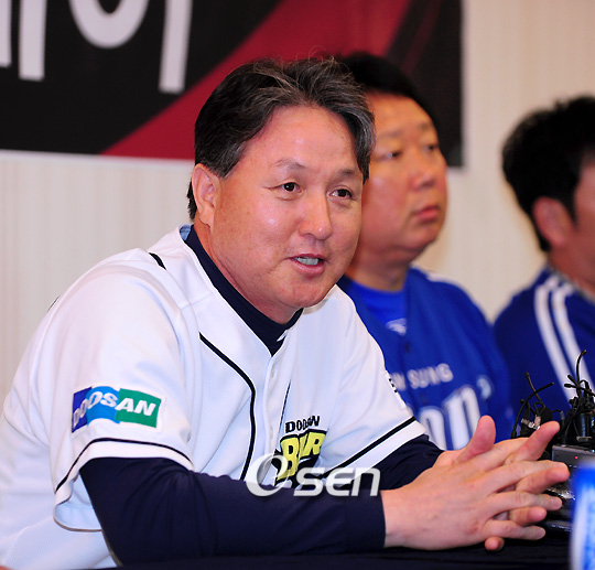 화끈하게 붙었다. 강수 대 강수로 한 치 물러섬이 없다. 16일 잠실구장에서 시작된 2008삼성 PAVV 프로야구 플레이오프 1차전에서 맞붙은 삼성 라이온즈와 두산 베어스가 ‘보내기 번트’ 없는 초강수로 맞서며 ‘공격 야구’의 진수를 선보였다. 김경문 두산 감독과 선동렬 삼성 감독은 초반은 물론 경기 중후반 득점 찬스에서도 ‘번트 작전’없이 강공으로 응수, 치열한 공방전을 펼치는 화끈한 공격으로 팬들을 즐겁게 했다. 롯데와 맞붙은 준플레이오프 때부터 경기 초반에는 번트를 대지 않겠다고 공언했던 선동렬 감독은 플레이오프서도 강공 작전으로 밀어붙였다. 선 감독은 3회 득점 찬스에서 번트 없이 강공작전을 구사, 대량득점에 성공했다. 9번타자 신명철과 1번 박한이의 연속 안타로 맞은 무사 1, 2루 찬스에서 2번 조동찬이 바스터(번트 모션을 취하다가 강공)를 구사했으나 파울에 그친 뒤 볼넷을 얻어내 무사 만루를 만들고 후속 양준혁, 진갑용의 연속 적시타 등으로 4점을 뽑았다. 보내기 번트로 아웃 카운트 하나를 날렸으면 4점까지 뽑기는 어려웠으나 선 감독은 강공으로 대량득점에 성공한 것이다. 선 감독은 1회에도 톱타자 박한이가 볼넷을 골라 출루했지만 강공 작전을 구사했다. 선 감독은 올 시즌 희생번트가 70개로 리그 전체 4위였다. 리그 평균보다 조금 높은 수치였으나 지난해보다 22개나 줄이는 등 올해는 달라진 면을 보였다. 준플레이오프서도 단 한 번의 보내기 번트 없이 3연승을 거뒀다. 팀도루 1위 팀답게 ‘발야구’와 화끈한 공격야구를 선호하는 김경문 두산 감독도 시종 강공작전으로 맞불을 놓았다. 김 감독은 0-4로 뒤진 4회말 공격서 2번 오재원의 안타와 3번 김현수의 볼넷으로 만든 무사 1, 2루에서 중심타자들에게 공격을 맡겼다. 중심타자들로 번트 공격을 펼치기에는 아까운 상황으로 홍성흔의 희생플라이로 한 점을 만회한데 이어 고영민의 적시 3루타 등으로 2점을 추가했다. 김경문 감독의 ‘뚝심’은 4-4로 맞선 7회말에 더욱 빛이 났다. 선두타자 이종욱이 볼넷으로 골라 나간 후 다음타자 오재원에게도 번트 사인 없이 강공을 구사, 또 다시 볼넷을 이끌어내며 득점 찬스를 이어갔다. 계속된 공격서 김현수 볼넷으로 만든 무사 만루에서 김동주의 희생플라이와 상대 실책 등에 편승해 귀중한 3점을 뽑아내며 역전에 성공했다. 4-4로 팽팽하게 맞서 있고 경기 후반인 점을 고려하면 선두타자가 출루한 후 다음 타자는 보내기 번트가 나올만한 상황이었지만 강공으로 밀어붙여 상대를 압박했다. 주자들의 빠른 발을 앞세운 특유의 ‘발야구’도 김 감독이 강공을 구사할 수 있는 믿는 구석이다. 김 감독은 7-4로 앞선 8회말 공격 무사 1루에서 전상렬에게 보내기 번트를 지시한 뒤 후속 이종욱의 적시 2루타로 굳히기 점수를 뽑아낸 것이 이날 양팀 통틀어 처음이자 마지막 번트 공격이었다. '눈에는 눈, 이에는 이'로 팽팽하게 맞선 경기는 결국 '발야구'로 삼성 수비진을 뒤흔든 두산이 8-4로 승리하며 먼저 웃었다. sun@osen.co.kr 지난 15일 미디어데이에서 화끈한 공격야구를 예고한 김경문 두산 감독과 선동렬 삼성 감독.