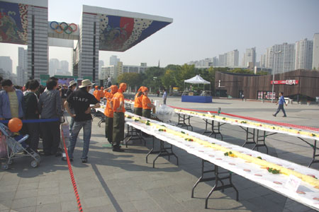‘2008 서울 기네스 푸드 페스티벌’이 세계에서 가장 큰 오므라이스 만들기에 도전했다. 지난 5월부터 서울시에서 진행하는 ‘2008 서울 기네스 푸드 페스티벌’에서는 ‘음식에 대한 도전’을 주제로 음식대결과 초대형 음식 만들기 등 색다른 볼거리와 참여형 문화행사를 제공했다. 10월의 마지막 이벤트, ‘초대형 오므라이스 만들기’는 길이 140m로 약 700인 분의 거대한 오므라이스를 만드는 행사다. 이미 영국 기네스월드레코드에 공식 기록도전을 신청해 놓은 상태로 한국기록원의 가이드라인에 따라 시작됐다. 완성된 오므라이스는 기록원의 기록측정 후 시민들에게 무료 제공돼 즐거움을 더했다. 이번 이벤트는 일반 시민들도 기네스에 도전하는 오므라이스를 직접 만들어 기록을 세우는데 한 몫을 하겠다며 행사에 앞장섰다. 부대행사로 마련된 ‘오므라이스 빨리 먹기 대회’도 시민들이 허겁지겁 오므라이스를 먹어대는 모습에 웃음을 자아내는 구경거리를 제공했다. 축제에 참여했던 시민들은 커다란 오므라이스를 직접 만들고 배불리 먹는 재미에다 입가심으로 아이스크림까지 준비된 센스 있는 축제라며 흥겨워했다. 무료 시식된 아이스크림 1500여 개는 (주)빙그레에서 제공한 것으로 ‘온가족 함께’하는 축제의 의미가 브랜드 명 '투게더'와 어우러졌다. 서울시에서 열린 ‘2008 서울 기네스 푸드 페스티벌’은 보여지는 축제가 아닌, 서울 시민이 함께 만들어가는 흥겨운 한마당으로 10월 마지막 행사를 성대히 마무리했다. jin@osen.co.kr ‘2008 서울 기네스 푸드 페스티벌’의 ‘초대형 오므라이스 만들기’ 행사.