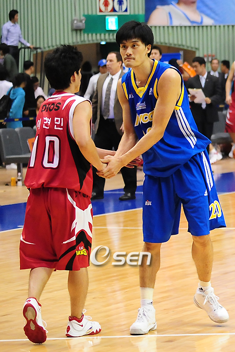 '2008-2009 KBL 남자 프로농구'서울 삼성 썬더스와 창원 LG 세이커스의 시범 경기가 21일 저녁 서울 잠실실내체육관에서 열렸다. 이 날 경기에서 LG는 브랜든 크럼프(14점 16리바운드)와 아이반 존슨 (20점 5리바운드) 그리고 신인 기승호(15점)의 활약에 힘입어 92-88로 삼성을 제압했다. 경기를 마치고 삼성 차재영이 LG 이현민과 악수를 나누고 있다./잠실체=민경훈 기자 rumi@osen.co.kr