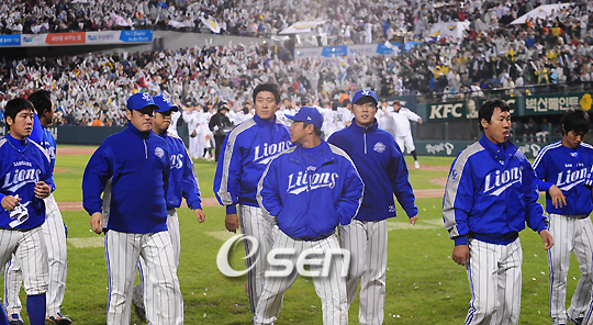 '2008 삼성 PAVV 프로야구' 플레이오프 6차전 두산 베어스와 삼성 라이온즈의 경기가 23일 잠실야구장에서 벌어졌다. 이 날 경기에서 두산은 5-2로 승리하며 시리즈 전적 4승 2패로 2년 연속 한국 시리즈 진출에 성공했다. 경기를 마치고 환호하는 두산 선수들을 뒤로하고 삼성 선수들이 덕아웃으로 쓸쓸히 들어서고 있다./잠실=민경훈기자rumi@osen.co.kr