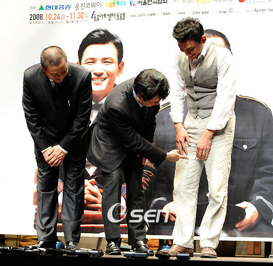 영화배우 황정민이 8년만에 꾸미는 연극무대인 연극 ‘웃음의 대학’(연출 이해제) 프레스콜이 24일 오후 서울 대학로 동숭아트센터 동숭홀에서 열렸다. ‘웃음의 대학’은 24일 저녁 초연해 내달 30일까지 이어지는 황정민-송영창의 2인극으로 일본작가 미타니 코우키의 작품이다. 기자 간담회 후 진행된 포토타임에서 미타니 코우키 작가가 황정민의 바지에 난 구멍을 기어이 찾아내 웃음을 주고 있다. /강희수 기자 100c@osen.co.kr