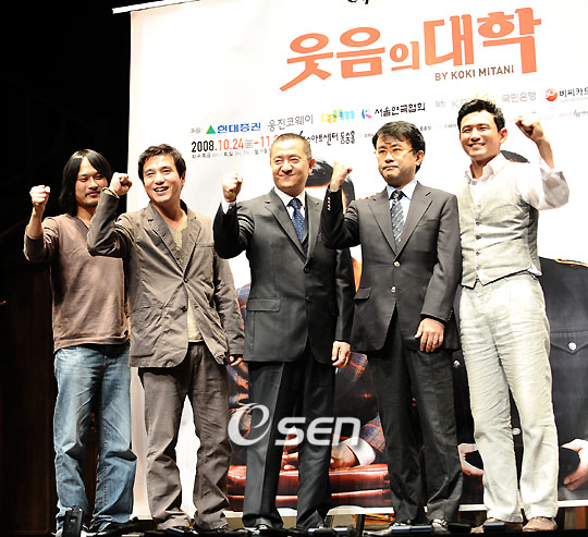 영화배우 황정민이 8년만에 꾸미는 연극무대인 연극 ‘웃음의 대학’(연출 이해제) 프레스콜이 24일 오후 서울 대학로 동숭아트센터 동숭홀에서 열렸다. ‘웃음의 대학’은 24일 저녁 초연해 내달 30일까지 이어지는 황정민-송영창의 2인극으로 일본작가 미타니 코우키의 작품이다. '웃음의 대학' 주요 관계자들(왼쪽부터 이해제 연출가, 조재현, 송영창, 미타니 코우키, 황정민)이 포토타임에서 파이팅을 외치고 있다. /강희수 기자 100c@osen.co.kr