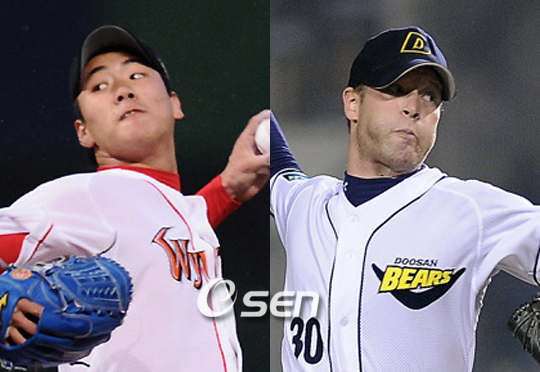 '1차전을 잡아라'. SK 와이번스 김광현(20)과 두산 베어스 맷 랜들(31)이 오는 26일 문학구장에서 열리는 한국시리즈 1차전 선발 격돌한다. 김광현은 한화 류현진(21)과 더불어 국내 최고의 좌완 선발. 올 시즌 27경기에 등판, 16승 4패(방어율 2.39)를 거뒀다. 다승-탈삼진 2관왕을 거머쥔 김광현은 안방에서 열리는 첫 대결을 승리로 장식할 각오. 상대 전적에서는 천적에 가까울 만큼 강한 면모를 드러냈다. 김광현은 올 시즌 두산전 여섯 차례 등판, 4승 1패(방어율 3.31). 특히 지난해 두산과의 한국시리즈에서 2경기에 선발 등판, 1승(방어율 0.00)을 따내 자신감은 가득하다. 스무 살 어린 나이에도 불구하고 올림픽 본선 무대에서도 겁없이 자신이 가진 능력을 100% 발휘할 만큼 배짱은 뛰어나다. 그러나 두산 홍성흔(타율 2할8푼6리, 14타수 4안타), 최준석(타율 3할6푼4리, 11타수 4안타 1타점), 오재원(타율 4할, 5타수 2안타)과의 대결에서는 약세를 보였다. 9승 9패(방어율 4.48)를 거둔 랜들은 두산 선발진의 마지막 보루나 다름없다. 두산은 삼성을 꺾고 한국시리즈 진출 티켓을 차지했지만 허약한 선발진이 옥의 티. 삼성과의 PO 5차전에 선발 등판, 5⅓이닝 10피안타(2피홈런) 1탈삼진 2실점으로 6-4 승리를 이끌었다. 상대 전적에서도 결코 뒤지지 않는다. 6경기에 등판, 2승 1패(방어율 1.27). 두산은 랜들에 이어 이재우(28), 임태훈(20) 등 특급 계투진을 가동해 SK 타선을 막아낼 것으로 예상된다. SK와 두산 양팀의 자존심을 건 첫 대결의 승패는 선발 투수의 어깨에 달려 있다. what@osen.co.kr 김광현-맷 랜들.