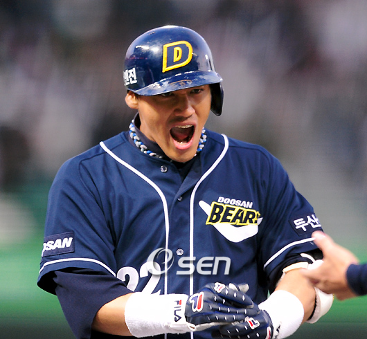 '2008 삼성 PAVV 프로야구' 한국시리즈1차전 SK 와이번스와 두산 베어스의 경기가 26일 인천 문학야구장에서 벌어져 두산이 아버지의 장례식 참가도 미룬 랜들의 역투와 최준석의 2타점 적시타를 앞세워 5-2로 서전을 승리로 장식했다. 9회초 1사 홍성흔이 승부에 쐐기를 박는 솔로홈런을 치고 환호하고 있다. /인천=손용호 기자spjj@osen.co.kr