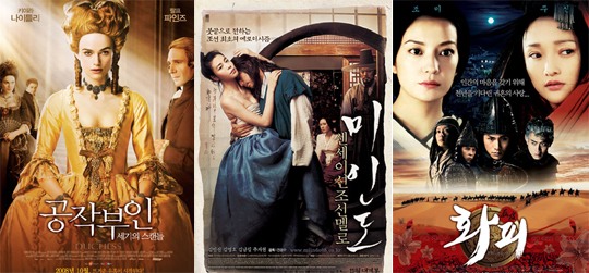 가을에서 겨울로 넘어가고 있는 연말 극장가에 이색적인 소재를 앞세운 동서양 시대극이 대세를 이루고 있다. 중국의 8대 기서 요재지이를 원작으로 한 판타지 멜로 ‘화피’와 18세기 영국을 발칵 뒤집어 놓은 조지아나 공작부인의 삶을 다룬 ‘공작부인: 세기의 스캔들’, 그리고 신윤복이 여자라는 발칙한 상상으로 시작된 조선 멜로 ‘미인도’가 그 주인공이다. 23일 개봉한 판타지 멜로 ‘화피’는 지금으로부터 2천년 전인 중국의 한ㆍ조 시대를 배경으로 사랑을 위해 요괴가 될 수밖에 없었던 왕생 장군의 아름다운 부인(조미)와 장군(진곤)의 마음을 갖고 싶었던 매혹적인 요괴(주신)의 기이한 사랑을 몽환적으로 담은 영화. 특히 ‘화피’는 ‘중국의 아라비안나이트’로 불리는 8대 기서 요재지이 속의 한 에피소드를 재해석한 인간과 요괴가 어우러진 기이한 세상을 배경으로 해 독특한 소재를 자랑한다. 김민선의 파격 노출로 화제를 모으고 있는 ‘미인도’는 에로틱하고 관능적인 그림을 그렸던 화가 신윤복이 남자가 아닌 여자였다는 도발적인 상상력으로 시작된 영화다. 그림 때문에 남장을 해야 했지만 사랑 앞에서는 여자이고 싶어했던 화가 신윤복과 그녀를 운명처럼 사랑한 남자 강무(김남길), 그리고 제자 신윤복을 탐하는 김홍도(김영호), 그들을 바라보며 질투에 사로잡히는 기녀 설화(추자현)까지 그림 ‘미인도’를 둘러싼 이들의 치명적인 사랑을 그린다. 영화 ‘공작부인: 세기의 스캔들’은 18세기 영국을 사로 잡았던 조지아나 공작 부인의 위험한 사랑과 스캔들을 다룬 작품이다. 결혼을 통해 신분상승이라는 부를 얻었지만 남편의 잦은 외도로 대중의 입에 오르내리는 불행한 결혼생활을 보내던 조지아나 공작부인은 급기야 맞바람으로 18세기 영국을 발칵 뒤집어 놓은 스캔들 메이커. 영화 ‘공작부인: 세기의 스캔들’은 실제 영국에서 있었던 사실이며 실제 故 다이애나 왕세자비의 삶과 비슷해 논란이 일기도 했다. 영화의 주인공 조지아나 공작부인이 故 다이애나비의 4대 선조로 밝혀져 더욱 화제가 되고 있다. crystal@osen.co.kr
