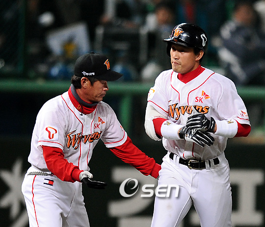 지난해 한국시리즈 MVP에 선정된 '캐넌히터' 김재현(33, SK)이 이틀 연속 홈런포를 가동하며 해결사 본능을 과시했다. 지난 26일 문학구장에서 열린 1차전에서 2회 선두 타자로 나서 두산 선발 맷 랜들(31)과 볼 카운트 0-1에서 2구째 높은 직구(137km)를 걷어 선제 중월 솔로 아치(비거리 120m)로 연결시킨 김재현은 27일 2차전에서도 3-2 불안한 리드를 지키던 7회 우중월 투런 아치를 쏘아 올렸다. 선두 타자 정근우가 볼넷을 골라 출루한 뒤 1루에서 견제 아웃돼 분위기가 다소 가라앉는 듯 했지만 박재상의 볼넷으로 만든 1사 1루서 김재현이 두산 세 번째 투수 임태훈과 볼 카운트 1-0에서 우중간 펜스를 넘기는 120m 짜리 투런 아치를 작렬했다. SK는 2-2로 팽팽하게 맞선 6회 박재상의 좌익선상에 떨어지는 1타점 2루타로 승기를 되찾은 뒤 추가 득점이 절실한 상황에서 김재현의 천금 같은 홈런으로 5-2로 달아났다. 김재현은 지난해 두산과의 한국시리즈에서 타율 3할4푼8리(23타수 8안타) 2홈런 4타점 5득점 맹타를 휘두르며 MVP를 차지한 바 있다. what@osen.co.kr '2008 삼성 PAVV 프로야구' 한국시리즈 2차전 SK 와이번스와 두산 베어스 경기가 27일 인천 문학야구장에서 열렸다. 7회말 1사 1루 SK 김재현 우월투런 홈런을 날리고 이광길 3루코치의 환영을 받으며 그라운드를 돌고 있다./인천=김영민 기자ajyoung@osen.co.kr