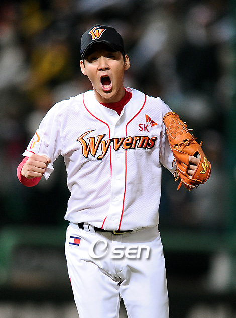 '믿을맨'이 떴다. SK 와이번스 우완 윤길현(25)이 한국시리즈 무실점 행진을 이어갔다. 지난해 두산과의 한국시리즈에 세 차례 마운드에 올라 2이닝 3피안타 2사사구 무실점 호투하며 반달곰 타선을 완벽하게 제압한 윤길현은 26일 1차전에서 1-3으로 뒤진 6회 2사 2루서 두 번째 투수로 마운드에 올라 첫 타자 채상병과의 대결에서 볼넷을 허용한 뒤 강판됐다. 그러나 윤길현은 27일 문학구장에서 열린 두 번째 대결에서 미스터 제로의 위력을 마음껏 발휘했다. 윤길현은 3-2 불안한 리드를 지키던 6회 마운드에 올라 2이닝 5탈삼진 무실점으로 완벽투를 뽐냈다. 윤길현은 김동주와 홍성흔을 잇달아 삼진 아웃시킨 뒤 고영민을 3루수 파울 플라이로 유도하며 6회 투구를 마쳤다. 윤길현의 7회 투구는 그야말로 화룡점정. 선두 타자 김재호를 헛스윙 삼진으로 돌려 세운 뒤 채상병과 전상렬도 헛스윙을 유도하며 5번째 삼진을 기록했다. 올 시즌 55경기에 등판, 1승 2세이브 14홀드(방어율 2.90)를 따낸 윤길현은 이번 한국시리즈에서 막강 허리 역할을 톡톡히 해내고 있다. 무엇보다 두산과의 상대 전적에서 2홀드를 따냈지만 방어율 4.82로 다소 고전했으나 한국시리즈에서 미스터 제로의 본능을 드러내며 정규 시즌의 부진을 만회했다. 한편 윤길현은 3-2로 앞선 8회 좌완 이승호와 교체됐다. what@osen.co.kr '2008 삼성 PAVV 프로야구' 한국시리즈 2차전 SK 와이번스와 두산 베어스 경기가 27일 인천 문학야구장에서 열렸다. 7회초 두산 공격때 SK 윤길현 투수가 세타자를 삼자범퇴 시키며 공수교대때 환호하고 있다./인천=김영민 기자ajyoung@osen.co.kr
