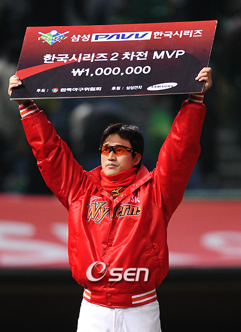 '2008 삼성 PAVV 프로야구' 한국시리즈 2차전 SK 와이번스와 두산 베어스 경기가 27일 인천 문학야구장에서 열렸다. SK 와이번스가 김재현의 투런 홈런포와 박재상의 결승타점에 힘입어 5-2 승리를 거두었다. 경기 종료후 한국시리즈2차전 MVP SK 김재현이 시상식을 마친후 팬들에게 인사를 하고 있다./인천=김영민 기자ajyoung@osen.co.kr