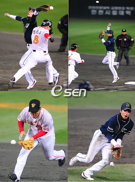 날씨가 갑자기 추워졌기 때문일까? 한국시리즈 2차전에서 실책이 속출했다. 양팀이 기록한 실책은 두산이 4개 SK가 1개였다. 두산의 실책 4개는 공교롭게도 모두 3루수 자리에서 일어났다. 김동주가 2개 김동주와 자리를 바꾼 오재원이 2개였다. SK는 5회초 2루수 정근우의 실책 하나. 그러나 4회초 홍성흔의 타구를 놓친 박재홍의 플레이도 기록되지는 않았지만 실책성에 가까웠다. 사진 위 왼쪽부터 시계방향으로 1.3회말 무사 정근우의 내야땅볼을 잡은 두산 3루수 김동주의 악송구로 1루수 오재원이 볼을 놓치고 있다. 2.4회말 무사 SK 최정의 평범한 3루 땅볼을 잡은 두산 김동주가 1루에 어이없이 높은 송구를 해 실책을 하고 있다. 3.3회말 무사 정근우의 내야땅볼을 잡은 두산 3루수 김동주의 악송구로 1루수 오재원이 볼을 놓치고 있다. 4.5회말 무사 SK 정근우의 땅볼을 두산 3루수 오재원이 놓치고 있다. 손용호 기자spjj@osen.co.kr