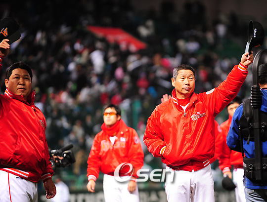 "두산은 앞으로 내려갈 지 모르지만 나빴던 우리는 조금씩 올라가는 흐름이다". 전날과 반대로 승장 인터뷰에 나선 SK 김성근(66) 감독은 확신에 찬 표정이었다. 농담을 섞는 여유도 여전했다. 김 감독은 27일 문학구장에서 열린 두산과의 한국시리즈 2차전에서 5-2로 전날 패배를 고스란히 설욕했다. 경기 후 그는 "어제(26일)보다 긴장을 덜 한 것 같다. 선수들이 게임에 좀더 익숙해졌다"며 "투수들은 스트라이크 존에 적응을 잘했다. 우리는 뒤가 중요한 팀인 만큼 나름대로 계산이 섰다. 하나 이긴 게 아니라 앞으로 계산이 가능해졌다"고 경기를 평했다. 특히 그는 전날 "돌파구를 찾았다"는 말을 한 것과 관련해서 "포스트시즌 내내 6할~7할을 친다는 것은 있을 수 없다"며 "두산은 (타격감이) 앞으로 내려오는 시점이 아닌가 생각한다. 반면 우리는 나쁜 상태에서 올라가는 흐름"이라고 설명했다. 더불어 김 감독은 선수들의 대한 칭찬을 아끼지 않았다. 2이닝 동안 5삼진을 잡은 윤길현에 대해서는 "2년 동안 제일 좋았던 것 같다"며 "이런 모습은 처음 봤다. 2이닝 잘 끊어줬다. 안좋으면 1이닝 후 조웅천으로 바꿀 생각이었다"고 말했다. 또 세이브를 올린 마무리 정대현에 대해서도 "(컨디션이) 정상적으로 올라 온 것 같다"며 "나름대로 잘 던져줬다"고 말한 뒤 선발 채병룡은 "올해 최고의 피칭이었다. 스피드건이 고장났는지 몰라도 145~146km가 찍혔다"고 극찬을 아끼지 않았다. 그러나 조동화의 견제사에 대해서는 "머리만 먼저 나가고 다리는 안나가더라"며 특유의 유머를 섞었지만 "두산이 신경을 많이 쓰고 나온 것 같다. 전날에 이어 조동화가 두 번 다 걸려 좀 그렇다"고 아쉬움을 나타내기도 했다. letmeout@osen.co.kr '2008 삼성 PAVV 프로야구' 한국시리즈 2차전 SK 와이번스와 두산 베어스 경기가 27일 인천 문학야구장에서 열렸다. SK 와이번스가 김재현의 투런 홈런포와 박재상의 결승타점에 힘입어 5-2 승리를 거두었다. 경기 종료후 김성근 감독과 이만수 코치가 관중에게 인사를 하고 있다./인천=김영민 기자ajyoung@osen.co.kr