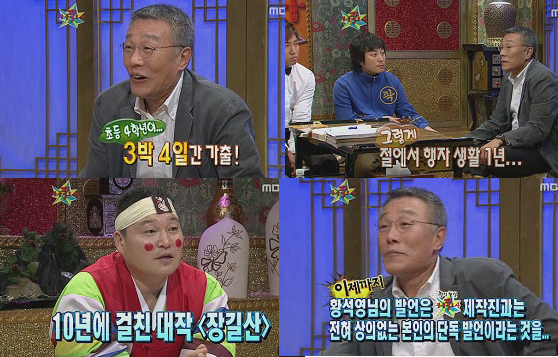 현대사의 산 증인 소설가 황석영(65)이 “나는 내면의 쓸쓸함을 가진 광대다”고 말해 눈길을 끌었다. 29일 방송된 MBC TV ‘황금어장-무릎팍도사’에 출연한 황석영은 과거 방황했던 어린 시절을 떠올리며 “고등학교 때 ‘사상계’ 신인상을 받으며 등단했다. 학교를 그만두고 남들보다 이른 시기에 등단해 작품 생활을 하면서 약속된 궤도에서 이탈한 것에 대한 좌절감이 컸다. 심지어는 여러 번 자살을 시도하기도 했다”고 털어놨다. 이어 그는 “연예인들을 보고 소위 광대라고 한다. 그런데 알고 보면 작가인 나도 광대다. 쓸쓸한 내면을 가지고 있지만 타인의 눈에 비춰지는 모습대로 살아가는 광대에 불과하다. 광대란 혼자 있을 때 가장 고독하고 슬프다”고 덧붙였다. 황석영은 자신의 어린 시절을 되돌아보며 “자신이 원하는 가치를 정했다면 두려워 말고 하고 싶은 대로 하라. 너무 먼 미래를 내다보고 미리 좌절하거나 절망하지 마라. 사람은 누구나 오늘을 살며 하루 속에 인생이 모두 들어있다”고 전했다. 이 날 황석영은 과거 별명이 ‘황구라’였음을 밝히며 “방송인 중에서도 김구라가 있고, 생명 공학을 연구하시는 어떠한 분도 한 때 구라라는 별명이 붙어 요즘에는 그 별명을 쓰지 않는다”고 말해 웃음을 선사했다. 또 10년에 걸쳐 완성된 대작 ‘장길산’을 연재했던 시절 창작에 대한 고통과 그에 얽힌 에피소드 등을 공개해 눈길을 끌었다. ricky337@osen.co.kr MBC '황금어장' 방송 장면 캡처.