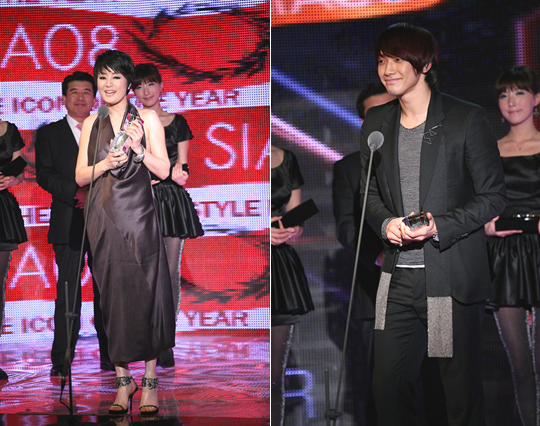 가수 비(26, 본명 정지훈)와 탤런트 장미희(50)가 대한민국을 대표하는 스타일 아이콘이 됐다. 두 사람은 지난 30일 오후 10시 서울 청담동의 한 클럽에서 진행된 ‘2008 스타일 아이콘 어워즈'에서 최고 영예인 '아이콘 오브 더 이어'에 선정됐다. 비는 화려하고 파워풀한 안무를 세계에 알리고 있고 장미희는 KBS 2TV 주말드라마 ‘엄마는 뿔났다’에서 우아하고 아방가르드한 아름다움을 표현해내며 중년 여성층은 물론 젊은 여성층의 롤모델로 떠오르고 있는 점 등에서 높이 평가됐다. 이날 비는 블랙수트 차림에 골드 술이 달린 스카프로 스타일을 마무리했고 장미희는 뒤태가 훤히 드러나는 드레스를 입고 등장해 눈길을 끌었다. 트로피를 손에 쥔 비는 “앞으로 옷 잘 입겠습니다”라고 큰소리로 외쳤고 장미희는 “오늘 의상 콘셉트는 현대적인 아름다움이다. 특히 목걸이로 포인트를 줬다”며 특유의 목소리로 수상소감을 전했다. 두 사람 이외에도 각 분야별 트랜드 리더로 꼽히는 ‘스타일 아이콘 10인’에는 손예진, 이정재, 빅뱅, 서인영, 추성훈, 김희애, 나경원, 김용호, 장윤주, 용재오닐이 뽑혔다. ‘특별부문상’에는 수영선수 박태환이 ‘월드아이콘’ 부문에, 정려원이 ‘패셔니스타’에, 션 정혜영 부부가 ‘뷰티풀 쉐어링’ 부문에 이름을 올렸다. 특히 故 이언에게 특별상이 주어져 장내 분위기가 숙연해 지기도 했다. 한편, ‘2008 스타일 아이콘 어워즈’는 한 해 동안 사회 문화 예술 각 계 각층에서 트렌드와 스타일을 주도한 스타를 선정해 시상하는 행사로 CJ미디어와 채널 올’리브에서 올해 첫 선을 보였다. 다음은 각 수상자 명단. 스타일아이콘 오브 더 이어 ▲스타일아이콘 오브 더 이어(남): 비 ▲스타일아이콘 오브 더 이어(여): 장미희 스타일 아이콘 10인 ▲여자배우: 손예진 ▲남자배우: 이정재 ▲TV 스타: 김희애 ▲남자가수: 빅뱅 ▲여자가수: 서인영 ▲스포츠: 추성훈 ▲정치: 나경원 ▲모델: 장윤주 ▲문화예술인: 김용호 ▲공연예술: 용재오닐 특별부문상 ▲월드아이콘: 박태환 ▲패셔니스타: 정려원 ▲뷰티풀쉐어링: 션, 정혜영 부부 ▲뉴아이콘: 샤이니 ▲특별상: 故 이언 ▲펀 피어리스 피메일: 손예진 yu@osen.co.kr 올리브 제공.