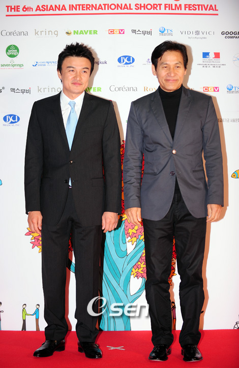 올해 6회째를 맞이하는 아시아나국제단편영화제(AISFF: Asiana International Short Film Festival)가 5일 오후 광화문 씨네큐브에서 열렸다. 5~10일 개최될 이번 영화제에는 모두 69개국 1,743편의 출품작 가운데 뽑힌 국제경쟁부문 수작들을 상영한다. 개막식에 참석한 박중훈과 안성기가 포토타임을 갖고 있다./윤민호 기자ymh@osen.co.kr