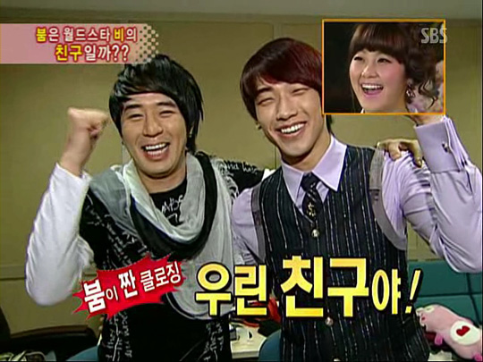 붐(26, 본명 이민호)이 방송 최초로 가수 비(26, 본명 정지훈)와 친구임을 증명했다. 그동안 붐은 방송에서 비를 ‘지훈이’라고 부르며 자신과의 친분을 주장해왔다. 그러나 사실을 입증할 만한 뚜렷한 증거가 없어 주변인들로부터 의심을 사왔다. 6일 밤 첫 방송된 SBS TV ‘연애시대-연애 발견’ 코너에서는 ‘연예인이 내 친구라면’이란 주제로 일반인들이 친구가 연예인과 친할 경우 보이는 반응들을 담았다. ‘후광효과’로 설명되는 이 반응은 대부분은 처음에는 무시하며 믿지 않다가 실제로 연예인이 등장하자 ‘대단하다’ ‘최고다’며 친구를 보는 태도가 180도로 달라져 웃음을 줬다. 첫 방송 특집으로 연예인에게도 ‘후광효과’가 적용되는지도 살폈는데 이날 주인공이 바로 붐이었다. 붐은 처음에 비를 만나기를 어색해했지만 곧 친구사이를 입증하기 위해 SBS ‘인기가요’ 출연자 대기실을 찾았다. 고등학교 시절 이후 첫 만남이었다. 붐을 만난 비는 “붐 친구 맞고요. 절대 의심 안하셔도 된다”며 붐과 친구 관계임을 확인했다. 하지만 이어 “둘이 있으면 반말해도 되는데 방송에서는 존대말 쓰는 게 어떻겠냐. (증명했으니) 이제 가”라며 표정을 달리해 주위를 폭소케 했다. 이날 두 사람은 ‘정지’ ‘캘리포니아 리민호’ 등 고등학교 때 서로의 별명을 확인하며 즐거운 시간을 가졌다. 비는 붐의 고등학교 입학식 때 머리 또한 기억했다. “올백이었고, 당시 붐의 외모가 꽃미남 될 뻔한 외모였다”며 “싸움 잘하는 척하는 이미지였다”고 말해 읏음을 자아냈다. 붐은 비에게 “옛날에 네가 빌려간 디바 CD 안돌려주냐”고 물었고, 이에 비는 “돌려줬다”며 주장해 웃음을 자아냈다. 붐은 이어 “네가 잘돼서 기억을 못하는지 모르겠지만 이제는 그거 필요 없고 너 사인 CD면 된다”고 덧붙여 더 큰 웃음을 샀다. 비는 또 “힘들었던 시절 붐이 어머니 장례식을 치러줘서 고마웠다”며 “19살 꿈이 가득했던 시절 장례식을 끝내고 친구들과 함께 목욕탕에 가서 서로의 꿈을 얘기하며 굳은 다짐을 했었다”며 “민호 씨가 잘돼서 좋다“고 덧붙였다. 두 사람은 마지막으로 전화번호를 교환하고 조만간 동창모임을 갖자며 발걸음을 돌렸다. yu@osen.co.kr SBS 화면 캡처.