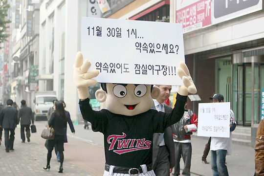 LG트윈스가 11월 7일 강남역, 삼성동 코엑스 등 서울시내 유동인구가 많은 10곳에서 이색 게릴라 마케팅을 진행했다. 이 이벤트는 LG가 오는 30일 잠실야구장에서 개최하는 '2008 Love Festival'을 알리고자 하는 목적에서 진행됐다. '2008 Love Festival'에서는 봉중근, 이대형, 조인성 등 LG트윈스 전 선수단이 참여해 팬들과 함께하는 시간을 가질계획이다. 참가는 LG트윈스 홈페이지(www.lgtwins.com)에서 할 수 있다.사진제공=LG 트윈스