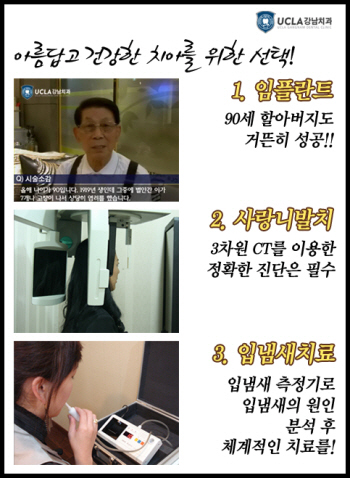 사람들은 치과를 무서워한다. 하지만 치아가 이상하다고 느낄 때 빨리 내원하는 것이 최고의 선택. 치아가 좋지 않으면 잘 먹지 못하게 되고 입 주위가 오그라들면서 얼굴이 변형되고 발음이 나빠져 심리적으로도 위축될 우려가 높다. 치아관리도 평상시에 하지 않고 또한 음식을 먹은 후 잘못된 이쑤시개 사용습관 등으로 인해 붓고 피나는 잇몸의 치료와 신경치료를 제때 받아야 함에도 차일피일 미루고 치과 가는 것에 두려움을 느껴 적정한 치료시기를 놓치는 것도 치아부실화의 한 원인이 되고 있다. 많은 사람들이 알고 싶어하는 치아상식을 통해 내 치아의 상태는 어떤지 확인해보고 차근차근 치료해가는 것이 현명할 듯하다. ♣ 임플란트 – 90세 할아버지도 거뜬히 성공! 치아를 한번 발치 하면 보철치료를 해주어야 하는데 예전에 많이 시술했던 틀니는 아무래도 씹는 힘이 좋지 않고 오래 사용하다 보면 잇몸도 헐어서 음식을 마음대로 먹을 수가 없는 단점이 있었다. 그에 대한 대안으로 요즘 많이 대중화된 임플란트 식립 시술이 있는데 임플란트란 자연치아가 있던 자리에 뿌리를 세우고, 치아 보철물을 올려 자연치아 역할을 대신할 인공치아를 만들어 주는 시술이다. 이런 임플란트 시술에 대해서 누구나 시술이 가능한지, 수술 중의 통증, 시술 후 관리 등에 대해서 궁금해 하는 사람들이 많다. 임플란트는 전신적 건강상태가 발치를 하는데 지장이 없을 정도라면 16-18세 이후는 나이에 관계없이 시술이 가능하다. 단 만성질환, 방사선 치료를 받은 환자, 정신질환을 가진 환자, 알코올 중독, 심한 흡연자 등은 이식대상자로 적합하지 못하므로 전문가와 미리 의논하는 것이 좋다고 한다. 너무 나이가 많은 경우라면? 사실 고령인 경우에는 신체적 나이보다는 건강나이가 더 중요하다. 보고에 의하면 80세 이상 고령의 환자도 수술이 성공적인 경우가 많으며, 꼭 나이가 많아서 수술이 불가능하다고 볼 수는 없다. 실제로 90세 고령환자의 임플란트 시술을 성공적으로 마쳤다는 청담동 임플란트전문치과 UCLA강남치과 정해웅 원장은 “임플란트를 식립할 경우 시술 대상자의 나이보다 건강나이가 중요하기 때문에 노년층이라도 식립이 가능하다. 술전 전신건강체크와 혹시 발생할 합병증에 미리 대비함이 더 중요하다. 과거 노년층은 당뇨와 고혈압 등의 질병을 앓고 있는 경우가 많아서 치료과정에서 발생할 수 있는 합병증, 상처의 치유지연, 수술 중 갑작스러운 혈압의 상승으로 임플란트 치료를 꺼려왔다. 하지만 요즘은 물방울 레이저와 3차원 CT촬영을 이용하여 시술이 이루어짐에 따라 높은 연령층의 시술 횟수가 늘어나고 있다.”라고 설명한다. 그리고 많은 사람들이 궁금해 하는 시술 중의 통증에 대해서는 전신마취나 수면마취가 아닌 국소마취 하에 시행하므로 특별한 경우를 제외하고는 거의 통증이 없으며 만약 통증이 있을 시 마취제를 추가하여 통증을 없앨 수 있다고 한다. 학계에 보고된 임플란트의 성공률은 93~95% 정도이다. 하지만 이런 성공률은 저절로 생기는 것이 아니라, 시술 후 꾸준한 사후관리와 주의사항 준수, 정기검진을 통해서만 성공률을 보장할 수 있다. 임플란트 시술이 많이 좋아졌다고 하더라고 자연치아를 완전 대체할 수 없기 때문에, 시술 후 정기적으로 검진을 받고, 금연과 가글링을 철저히 하면 성공적인 시술로 마무리 할 수 있다. ♣ 사랑니 – 더 이상 대학병원에서 기다리지 마세요! 일반적으로 사랑니 발치인 경우 위쪽 사랑니는 쉽게 통증 없이 뽑을 수 있으나 아래쪽 사랑니인 경우는 옆으로 누워서 나는 경우가 많다고 한다. 발치 하는데 큰 어려움은 없지만 CT촬영으로 정확한 진단이 필요하다. CT 등의 시설이 갖춰지지 않은 개인병원에서는 누워있는 사랑니 발치에 대해 대부분 난색을 표하는 경우가 많은데, CT 등으로 정확한 진단이 이루어지지 못하는데다 시술 시간도 오래 소요되기 때문이다. 종합병원에서 발치 할 경우 시스템적인 면에서는 좋을 수 있지만 오랜 기간 예약이 안될 수도 있으며, 미숙련의에 의해 오랜 시간 고생하는 경우가 많다고 한다. 사랑니 발치를 할 경우 CT 등의 진단 기계가 잘 갖춰져 있는 사랑니발치 전문병원에서 구강외과 전문의에게 진료받는 것이 좀더 편안하고 안전한 시술의 지름길이다. ♣ 입냄새 – 입냄새로 인한 스트레스 NO, 정확한 분석 후 체계적인 치료를! 입냄새는 성인들의 65%에서 나타나며, 냄새를 맡게 되는 상대방을 불쾌하게 할 뿐 아니라 냄새를 풍기는 자신까지 위축된다. 구취가 생긴 원인에 따라 치료가 다르므로 꼭 병원을 내원하여 그 원인을 알아 보아야 한다. 입냄새 치료를 위해 내원한 환자를 조사한 바에 따르면 입냄새의 발생원인은 충치, 잇몸질환, 설태, 불량보철물 등의 구강질환이 전체의 85~90%이고, 나머지는 축농증, 비염 등 코 질환이나 간 콩팥 위장 허파 등의 질환 때문에 생긴다고 한다. 이처럼 대부분의 성인에게서 나타난다고 해서, 또는 어쩔 수 없는 것이라고 단정지어서는 안 된다. 보다 과학적인 치료방법으로 접근할 수 있어야 한다. 치과에서 시행하는 입냄새 치료의 방법은 우선 입냄새