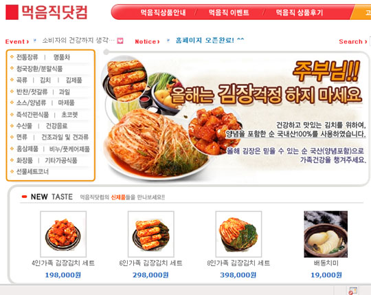 “믿음직한 김치로 주부들의 고물가 부담을 덜겠다.” ‘고향김치’라는 브랜드로 알려진 ㈜충청종합식품이 ‘먹음직닷컴(www.mukumgic.com)’을 통해 김장 대행서비스를 시작한다. 배추는 물론 양념까지 ‘100% 국산’이라는 신뢰성을 내걸고 주부들의 ‘김장 스트레스’를 풀어 주겠다고 선언했다. 충남 당진에서 나는 배추, 강원 홍천에서 나는 무, 충북 음성에서 나는 고춧가루, 충남 서산에서 나는 마늘, 전남 목포에서 나는 멸치액젓 등이 충청식품에서 쓰는 재료들이다. 단순히 ‘중국산이 아니다’는 주장이 아니라 ‘순수 한국산’이라는 수식을 강조하고 있다. 가격 경쟁력에도 신경을 썼다. 올 김장 비용을 4인 가족 기준 21만 9500원(배추 15포기, 무 15개, 국산 재료 기준)으로 예상하고 있는데 ‘먹음직닷컴’에서는 이보다 저렴한 19만 8000원(택배비 포함)에 상품을 내놓았다. 이 4인 가족 메뉴(40kg)는 배추 10포기(20kg), 깍두기 4kg, 백김치 2포기(4kg), 총각김치 4kg, 동치미 4kg, 보쌈김치 2포기(4kg)로 구성된다. 60kg짜리 6인 가족 메뉴는 29만 8000원, 80kg짜리 8인 가족 메뉴는 39만 8000원에 각각 판매 된다. 천안 직산읍 군서리에 사업장과 공장을 두고 있는 충청식품은 지난 1987년 충남 광천에서 김치생산을 시작한 이래 충청지역 김치 전문제조업체로 성장하고 있다. 30여 곳의 초중고, 대학을 비롯해 홈쇼핑업체, 캐더링 업체, 병원, 수련원 등 200여 곳에 납품하고 있다. 문의 02) 2052-0021. 100c@osen.co.kr 먹음직닷컴의 초기화면.