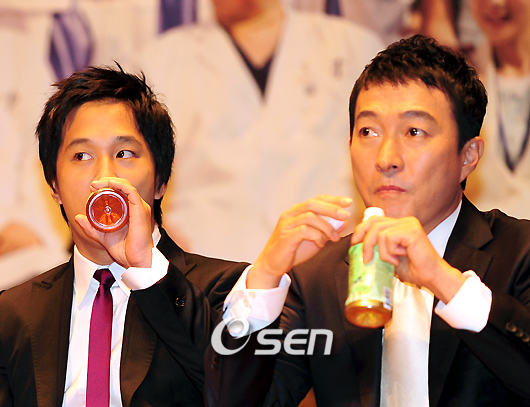 메디컬 드라마의 효시였던'종합병원'이 시즌 2로 새로이 시청자를 찾아온다. MBC는 1994년 공전의 히트를 기록했던 드라마'종합병원'을 시즌 2 형식으로 수목 미니시리즈'종합병원2'로 제작 12일 강남 성모병원에서 주연배우 김정은 차태현 이재룡 이종원 도지원 등 이 참석한 가운데 제작발표회를 가졌다. 기자간담회에서 이재룡과 차태현이 물을 마시고 있다./손용호 기자spjj@osen.co.kr