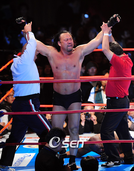 "나 아직 죽지 않았다". 노장 프로레슬러 이왕표(54)가 12일 서울 올림픽공원 제 2체육관에서 열린 '포에버 히어로'대회서 밥 샙(34)을 1라운드 1분 57초 만에 암바로 꺾고 울트라FC 챔피언 벨트를 거머쥐었다. 밥 샙을 꺾은 이왕표는 경기 때문에 머리가 산발로 될 만큼 격하게 싸웠다. 경기가 끝난 후 이왕표는 "여러분 이왕표 해냈습니다"고 승리의 기쁨을 나타낸 뒤 "이왕표가 해냈다. 아직 죽지 않았다"면서 "여러분의 뜨거운 성원에 승리를 거둘 수 있었다. 저 놈을 완전히 눕혀버렸다"고 승리 소감을 밝혔다. 이어 그는 "여러분의 성원을 영원히 간직하겠다"며 "여러분 사랑합니다!"고 절규했다. 이왕표는 "프로레슬링을 하는 것인데 종합격투기 룰로 하게 되어 답답함을 느끼기도 했지만 사나이로서 한번 해보자고 마음 먹었다"고 설명했다. 밥 샙의 펀치에 대해 이왕표는 "내가 주먹에 굉장히 약하다. 밥 샙의 주먹은 해머로 맞는 느낌이었다. 그러나 내가 쓰러지면 안된다는 정신력으로 끝까지 버텼다"고 말했다. 이왕표는 이날 이벤트를 마친 소감에 대해 "하늘에 계신 김일 선생님께 감사의 말씀을 드리고 편안하게 계시기를 바란다"며 후계자로서 스승에 대한 예를 표했다. 이번 대회는 지난 2006년 10월 타계한 전설적인 프로레슬러 고 김일을 추모하는 이벤트로 올해 3회를 맞았다. 10bird@osen.co.kr 관련 기사 ▶ 밥 샙, "이왕표의 경기 운영이 최홍만 보다 낫다" ▶ [사진]이왕표,'내 펀치도 맞아봐!' ▶ [사진]이왕표,'여기서 승부내야 해!' ▶ [사진]이왕표, 돌려차기 공격! ▶ [사진]이왕표,'여러분 잘 보셨죠!'