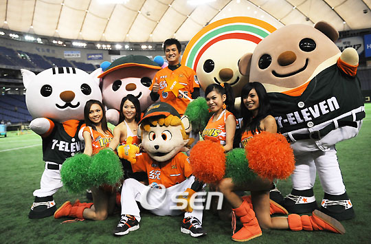 '2008 아시아시리즈' 대만 대표 퉁이 라이온즈와 중국 대표 텐진 라이온즈의 경기가 13일 일본 도쿄돔 구장에서 벌어져 대만이 9회까지 1점을 뒤지고 있다 9회말 판우시옹의 역전타로 7-4로 힘겨운 역전승을 거두었다. 9회말 2사 주자 1,2루서 역전 끝내기 홈런을 친 퉁이 판우시옹이 치어리더들과 포즈를 취하고 있다./도쿄돔=민경훈기자rumi@osen.co.kr