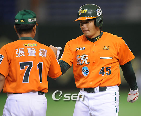 '2008 아시아시리즈' 대만 대표 퉁이 라이온즈와 중국 대표 텐진 라이온즈의 경기가 13일 일본 도쿄돔 구장에서 벌어져 대만이 9회까지 1점을 뒤지고 있다 9회말 판우시옹의 역전타로 7-4로 힘겨운 역전승을 거두었다. 9회말 2사 주자 3루 퉁이 구어준요우가 좌중간 동점 1타점 적시타를 친후 코치와 하이파이브를 하고 있다./도쿄돔=민경훈기자rumi@osen.co.kr