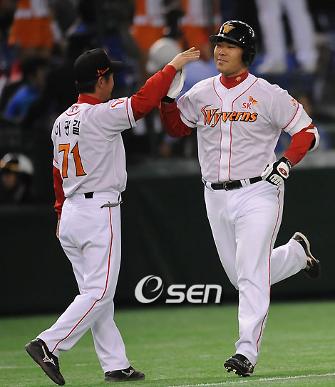 2년 연속 한국시리즈를 제패한 SK가 아시아 정상을 향한 첫 발걸음을 힘차게 내딛었다. SK는 13일 도쿄돔에서 열린 2008 아시아시리즈 일본시리즈 우승팀 세이부 라이온스와의 홈경기에서 이재원의 결승투런포와 철벽 불펜진의 이어던지기가 빛을 발해 4-3의 짜릿한 역전승을 거뒀다. 이로써 SK는 앞선 경기에서 9회 끝내기 스리런포로 중국에 7-4로 극적인 역전승에 성공한 대만 퉁이 라이온스와 공동선두를 형성했다. 결승진출에 가장 큰 고비를 넘어선 셈이다. 또 지난해 예선전에서 주니치 드래건스를 누른데 이어 일본전에서 2승(2패)째를 거뒀다. 관심을 모았던 선발 김광현은 이날 초반부터 실점하는 등 5회를 넘기지 못해 '일본킬러' 명성을 이어가는데 실패했다. 그러나 타선은 무서운 집중력을 발휘, 무시할 수 없는 1.5군으로 맞선 세이부를 상대로 무서운 집중력을 발휘했다. 이날 세이부는 붙박이 톱타자 가타오카 야스유키를 선발에서 제외시키는 등 대부분 세대교체 직전의 주축 선수들을 전면에 내세웠다. 기세를 먼저 올린 것은 세이부였다. 세이부는 1회 톱타자로 나선 아카다 쇼고의 우중간 2루타로 포문을 었다. 이어 구리야마 타쿠미가 2루 땅볼로 진루타를 만들어 1사 3루 찬스를 열었고 히라오 히로시가 중전적시타를 쳐냈다. 그러나 올 시즌 전부터 2008 아시아 시리즈 우승을 목표로 내걸었던 SK는 2회 박재홍이 날린 행운의 동점 솔로포로 순식간에 동점을 만들었다. 박재홍의 이 동점포는 논란의 여지를 남기며 5분간 경기가 중단되기도 했다. 중국 출신의 리 웨이정 3루심은 양손을 들어 박재홍의 타구를 파울로 선언했다. 하지만 박재홍은 1루와 2루를 돌아 3루까지 밟았다. 그런데 이 과정에서 3루심은 박재홍에게 그만 뛰라는 제재를 가하지 않았고 주심과 상의한 후 이미 홈까지 밟은 박재홍의 홈런을 인정했다. 이에 와타나베 세이부 감독이 나와 항의했지만 번복되지 않았다. 기세를 탄 SK는 4회 이진영의 중전안타 뒤 이재원의 폴대를 맞히는 역전 좌월 투런포로 3-1로 달아났고 계속된 1사 1, 2루에서 박재상의 좌전적시타로 1점을 보탰다. 그러나 세이부의 추격도 만만치 않았다. 선발 김광현은 1회 실점 후 2회부터 4회까지 실점없이 막아냈다. 하지만 4-1로 앞선 5회 구리야마 다쿠미의 1타점 2루타와 히라오 히로시의 좌전적시타를 맞아 4-3까지 추격을 허용한 뒤 폭투와 견제 실책으로 2사 1, 3루 위기를 자초한 채 물러났다. 4⅔이닝 동안 7피안타 2볼넷 1폭투로 3실점했고 삼진은 5개를 잡았다. 김광현에 이어 마운드에 오른 윤길현은 고토 다케토시를 중견수 플라이로 처리해 리드를 지켰다. SK는 이후 정우람, 이승호 등 필승 계투진을 풀가동, 무실점으로 승리를 지켜냈다. 윤길현은 ⅔이닝, 정우람은 ⅔이닝, 이승호는 3이닝을 각각 틀어막았다. 이승호는 승리투수가 되며 두 배의 기쁨을 누렸다. 왼쪽 아킬레스건 부상으로 출장이 불가능할 것으로 보였던 포수 박경완은 8회부터 안방을 찾아 '세이브 포수'로서의 위력을 선보였다. letmeout@osen.co.kr '2008 아시아시리즈' 한국 대표 SK 와이번스와 일본 대표 세이부 라이온즈의 경기가 13일 일본 도쿄돔 구장에서 벌어졌다. 4회말 무사 주자 1루 이재원이 좌측 투런 홈런을 날린 후 3루에서 이광길 코치와 하이파이브 하며 홈인하고 있다./도쿄돔=민경훈 기자 rumi@osen.co.kr