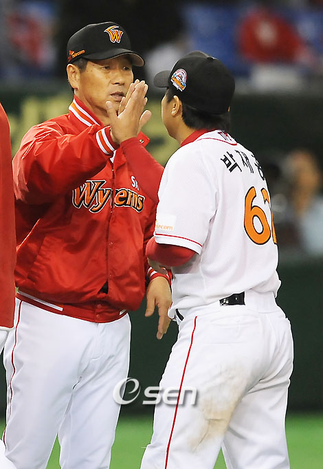 '2008 아시아시리즈' 한국 대표 SK 와이번스와 일본 대표 세이부 라이온즈의 경기가 13일 일본 도쿄돔 구장에서 벌어졌다. 이 날 경기에서 SK는 이재원의 결승투런포와 철벽 불펜진의 이어던지기가 빛을 발해 4-3의 짜릿한 역전승을 거뒀다. 경기를 마치고 SK 김성근 감독이 박재홍과 하이파이브를 하고 있다. /도쿄돔=민경훈 기자 rumi@osen.co.kr