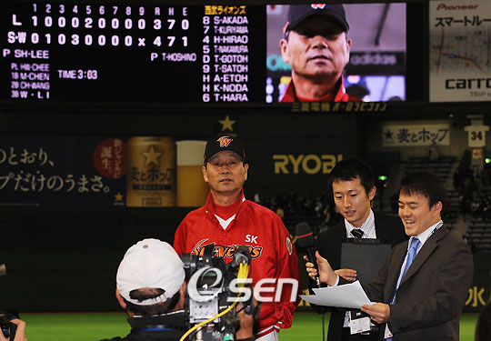 '2008 아시아시리즈' 한국 대표 SK 와이번스와 일본 대표 세이부 라이온즈의 경기가 13일 일본 도쿄돔 구장에서 벌어졌다. 이 날 경기에서 SK는 이재원의 결승투런포와 철벽 불펜진의 이어던지기가 빛을 발해 4-3의 짜릿한 역전승을 거뒀다. 경기를 마치고 일본 방송사에서 SK 김성근 감독을 인터뷰 하고 있다./도쿄돔=민경훈 기자 rumi@osen.co.kr