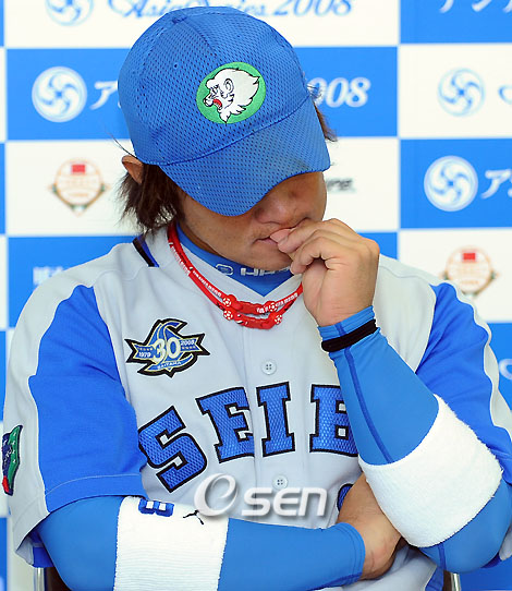 '2008 아시아시리즈' 한국 대표 SK 와이번스와 일본 대표 세이부 라이온즈의 경기가 13일 일본 도쿄돔 구장에서 벌어졌다. 이 날 경기에서 SK는 이재원의 결승투런포와 철벽 불펜진의 이어던지기가 빛을 발해 4-3의 짜릿한 역전승을 거뒀다. 경기를 마치고 가진 기자회견에서 일본의 히라오가 손톱을 물어뜯고 있다. /도쿄돔=민경훈 기자 rumi@osen.co.kr
