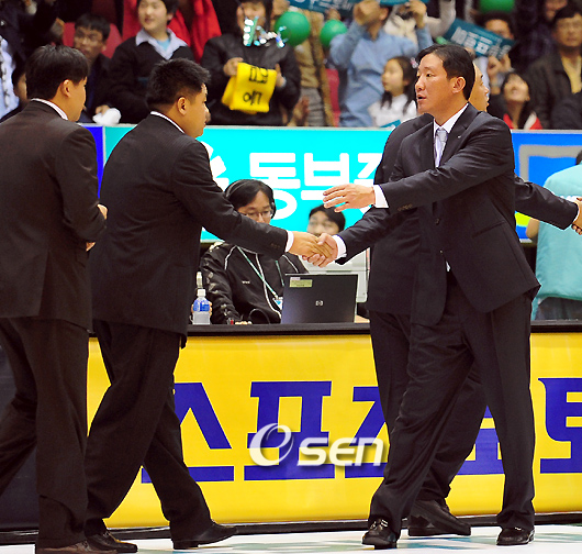 '2008-2009 동부 프로미 프로농구' 공동 1위를 달리고 있는 원주 동부와 전주 KCC가 15일 원주 치악체육관에서 1위 자리를 놓고 열띤 경기를 벌여 동부가 79-56의 손쉬운 승리를 거두며 단독 1위로 올랐다. 경기가 끝나고 허재 KCC 감독이 중앙대 후배인 강동희 동부 코치와 악수를 나누고 있다./원주=손용호 기자spjj@osen.co.kr