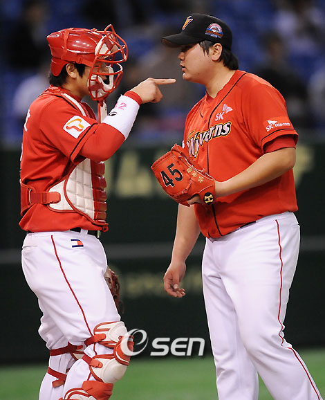 '2008 아시아시리즈' 한국 대표 SK 와이번스와 대만 대표 퉁이 라이온스의 경기가 15일 일본 도쿄돔 구장에서 벌어졌다. 1회말 1사 주자 1,2루 퉁이의 가오구어청 타석에서 SK 채병용의 높은 투구에 정상호 포수가 점프를 했지만 못잡아내고 그 틈을 타 주자들이 이동을 하자 정상호 포수가 손짓을 하며 이야기 내고 있다./도쿄돔=민경훈기자rumi@osen.co.kr