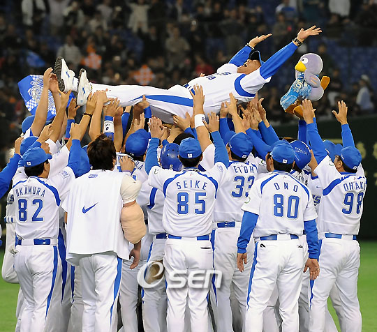 '2008 아시아시리즈' 일본 대표 세이부 라이온스와 대만 대표 퉁이 라이온스의 결승전 경기가 16일 일본 도쿄돔 구장에서 벌어졌다. 이 날 세이부는 9회말 사토의 1타점 끝내기 안타로 1-0으로 간신히 이겨 2008아시아시리즈 우승을 차지했다. 경기를 마치고 세이부의 선수들이 와타나베 감독을 헹가래 치고 있다./도쿄돔=민경훈 기자 rumi@osen.co.kr