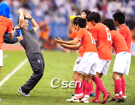 "세대교체가 성공적으로 이루어졌다". 허정무 감독이 이끄는 한국축구대표팀은 20일(한국시간) 사우디아라비아 리야드 킹 파드 스타디움에서 열린 2010 남아공월드컵 아시아지역 최종예선 B조 3차전 사우디와의 경기에서 후반 32분 터진 이근호의 선제골과 종료 직전 박주영의 추가골로 2-0 승리를 거뒀다. 19년만의 무승 징크스를 날려 버린 허정무 감독은 승리에 대해 큰 기쁨을 나타냈다. 허 감독은 경기 후 가진 인터뷰서 "사우디전을 대비해 카타르에서 준비했다"며 "초반에 위기가 있었지만 잘 넘겼다. 그 다음부터는 의도한 데로 경기를 풀어나갔다"고 소감을 밝혔다. 이어 허 감독은 "골이 안 터지는 상황에서 이근호가 골을 터트려 이겼다. 모든 선수들이 잘 맞춰 잘한 경기였다고 생각한다. 앞으로 남은 경기도 쉽게 이길 수 있도록 노력하겠다"고 전했다. 지난해 12월 대표팀 선장에 부임한 허정무 감독은 지난 월드컵 3차예선서 무기력한 모습으로 비난의 뭇매를 맞았다. 하지만 아시아지역 최종예선에서 승리를 통해 새로운 도약의 기회를 만들었다. 허 감독은 "사실 처음 대표팀을 구성하면서 어려운 점이 많았다"며 "국내무대에서 활약하던 선수들이 국제 무대에서 어떤 활약을 할 지가 어려웠다. 그러나 이제 어느 정도 궤도에 올라왔다고 생각한다"고 고충을 드러냈다. 또 허정무 감독은 "앞으로 더 강해질 수 있다고 생각한다. 세대 교체가 원만하게 이뤄지고 있다"며 "이 선수들이 괄목할만한 성장을 하고 있는 것이 우리의 성장이다"고 말했다. 한편 허정무 감독은 "심판 판정에 대해서는 존중할 필요가 있다. 화면에 나오지 않은 부분에 대해서는 비디오테이프로 확인해보면 알 것이다"면서 "이란전은 준비기가닝 짧기에 힘든 경기가 될 것이라고 생각한다"고 덧붙였다. stylelomo@osen.co.kr 후반 이근호가 골을 넣고 허정무 감독에게 달려가자 허정무 감독이 좋아하고 있다./사우디아라비아=손용호기자spjj@osen.co.kr