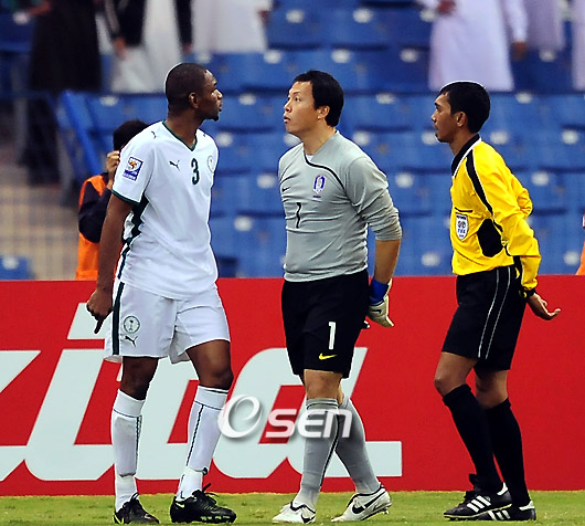 2010 남아공월드컵 아시아 최종예선 한국과 사우디아라비아의 3차전 경기가 20일 사우디아라비아 킹파드 스타디움에서 벌어져 한국이 이근호와 박주영의 골로 19년만에 2-0의 승리를 거두었다. 후반 사우디 나이프 아메디가 헐리우드 액션으로 옐로우 카드를 받아 경고누적으로 퇴장을 당했다. 이운재가 항의하는 레다 모하메드와 가벼운 말다툼을 하고 있다./사우디아라비아=손용호기자spjj@osen.co.kr