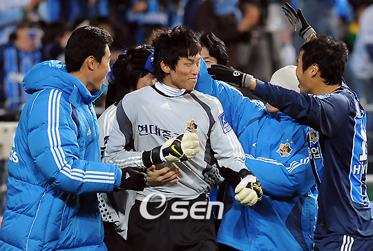 '삼성 하우젠K리그 2008' 6강 플레이오프 울산 현대와 포항 스틸러스의 경기가 22일 오후 울산월드컵경기장에서 벌어져 연장까지 0-0으로 비긴 뒤 승부차기 끝에 울산이 승리를 거둬 준플레이오프에 진출했다. 포항의 첫 두 킥을 막아내 승리에 일등공신이 된 울산 골키퍼 김승규에게 이진호가 다가서며 축하하고 있다./울산=윤민호 기자ymh@osen.co.kr