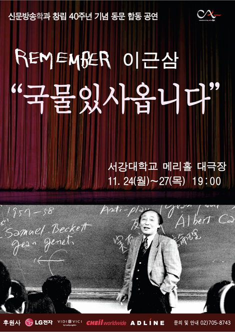 한국 희극의 대표작가 故이근삼을 다시 기억하게 하는 연극 ‘REMEMBER 이근삼 - 국물 있사옵니다’가 무대에 오른다. 고인 이근삼은 1960년대 사실주의적인 극작술에 반기를 들고 다양한 형식실험을 한 극작가다. 그를 추모하기 위해 마련된 연극 ‘국물 있사옵니다’는 지난 1966년 초연된 작품으로 상식이 통하지 않는 한국사회를 비판한 수작으로 꼽힌다. 연극 ‘국물 있사옵니다’는 이해심 많고 선량했던 김상범이라는 인물이 출세에 눈을 뜬 후부터 비열하고 냉혹한 인간으로 변해가는 모습을 그렸다. 자신의 목적을 달성하기 위해 수단과 방법을 가리지 않는 출제 지향주의자를 대표적인 인물로 변해가는 모습을 이야기 한다. 무엇보다 고인 이근삼 특유의 독특한 화술과 풍자정신으로 현실적 가치질서를 왜곡, 전도시켜 현대 한국사회가 지니고 있는 허점을 풍자한 소극이다. 새로운 시각으로 현대 사회에 맞게 바뀐 이번 공연은 2008년 현재의 한국사회를 비추는 거울이 될 것으로 기대를 모은다. 이번 공연은 서강대학교 신문방송학과 40주년 행사 기념으로 고인 이근삼을 그리는 제자들이 함께 준비했다. 공연 기간은 11월 24일(월)~27일(목) 오후 7시, 서강대 메리홀(02-705-8743)에서 열리고 입장료는 무료다. jin@osen.co.kr 연극 ‘국물 있사옵니다’ 포스터.