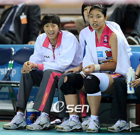 남녀 통틀어 최고 몸값으로 유니폼을 갈아입은 흥국생명 한송이(24)가 부상 회복기간이 길어지면서 경기장에서 눈물을 흘렸다. 한송이는 지난 25일 천안 유관순 체육관에서 열린 NH농협 2008-2009 GS칼텍스와 홈개막전을 앞두고 선수들이 몸을 푸는 모습을 지켜보면서 눈물을 훔쳤다. 연봉 1억 5000만 원에 한국도로공사에서 흥국생명으로 둥지를 옮긴 한송이는 김연경 황연주와 함께 막강 공격라인을 구축할 것으로 시즌 전부터 예상됐다. 그러나 무릎 수술을 받고 코트 복귀에 성공한 김연경 황연주와 달리 발목 수술을 받은 한송이는 시즌 개막 전 뜻하지 않은 허벅지 근육 통증이 생겨 코트에 나서지 못하고 있다. 한송이가 지켜보는 가운데 이 날 김연경은 여자 프로배구 사상 첫 개인 통산 2000득점을 돌파하는 등 활약했다. 흥국생명 구단관계자에 따르면 "최고 몸값을 받지만 홈 팬들 앞에서 경기에 나서지 못하자 괴로워하더라"고 한송이의 현재 심경을 설명했다. 이 날 경기는 흥국생명이 풀세트 접전 끝에 GS칼텍스를 꺾었다. 경기 후 황현주 감독은 "왼쪽 허벅지 근육통이다. 당분간 경기에 출전하기 힘들며 빠르면 2라운드 중반에 출전이 가능하다"고 말했다. 이어 황 감독은 "하지만 상태를 지켜봐야 한다"며 회복 속도가 더디면 한송이의 복귀 시기가 2라운드를 넘길 수 있음을 시사했다. "본인이 매우 답답해 한다"고 심경을 전했다. 하루라도 빨리 코트에서 자신의 실력을 뽐내고 싶은 마음과 달리 몸이 말을 듣지 않자 한송이는 눈물로 답답한 마음을 달래고 있었다. 7rhdwn@osen.co.kr 지난 25일 천안 유관순실내체육관에서 열린 GS칼텍스와의 경기에서 흥국생명 한송이(왼쪽)가 벤치에서 동료들을 격려하고 있다./천안=김영민 기자 ajyoung@osen.co.kr