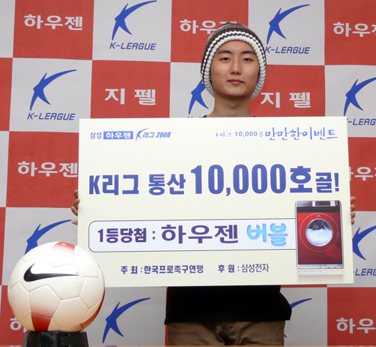 'K-리그 10,000호골 만만한 이벤트'의 행운의 주인공으로 박주환(19.남)씨와 김태홍(27.남)씨가 뽑혔다. 이들에게는‘하우젠 버블 드럼세탁기’와‘하우젠 아삭 칸칸칸 김치 냉장고’가 선물로 각각 주어진다. 한국프로축구연맹은 'K-리그 10,000호골 만만한 이벤트'를 지난 10월 8일부터 11월 9일까지 K-리그와 네이버 홈페이지에서 진행했다. 이번 이벤트는 K-리그 10,000호골 주인공을 예상해보고 ‘일.만.호’를 시제로 3행시를 짓는 것이다. ‘10,000호 3행시 짓기’ 이벤트에 접수된 총 723편의 응모 작품 가운데 1등으로 뽑힌 박주환씨는 “기대도 안했는데 ‘하우젠 버블 드럼세탁기’라는 큰 선물을 받게 돼 정말 기쁘다. 어머니가 이 기회에 세탁기를 바꾸게 되었다며 가장 기뻐하셨다”며 소감을 밝혔다. 그의 응모작은 "일: 일분일초 눈을 뗄 수 없는 곳, 만: 만원관중! 뜨거운 함성소리! 화끈한 골 잔치!, 호: 호주머니 걱정하지 마시고 자녀, 친구, 연인과 함께 축구장으로 놀러오세요~"로 축구장의 즐거움을 주변사람들에게 알리는 내용을 담고 있다. 또 다른 이벤트인 ‘10,000호골 주인공 맞히기’에서는 10,000호골 주인공(부산 김태영)을 맞힌 정답자가 전체 응모자 4,153명 중 단 한명에 불과했다. 1등 상품 ‘하우젠 아삭 칸칸칸 김치냉장고’의 주인공은 바로 경북 영주에 거주하는 김태홍씨는“이번 10,000호골 주인공 맞히기 이벤트를 접하고 K-리그 홈페이지에서 선수 명단을 확인하며 어떤 선수를 적을지 고민했다. 하지만 축구 경기에서 골은 누구나 넣을 수 있는 것 아닌가. K-리그 선수 거의 모두를 일일이 적어 보냈다.”며 이벤트에 응모한 과정을 설명했다. 한편 연맹은 'K-리그 10,000호골 만만한 이벤트'에 참가한 축구팬 가운데 30명을 추첨해 EA게임CD를 선물로 제공하며 당첨 결과는 K-리그 홈페이지(www.k-leaguei.com) 이벤트 코너에서 확인이 가능하다. 7rhdwn@osen.co.kr 3행시 짓기 1등에 뽑힌 박주환(19)씨가 경품 ‘하우젠 버블 세탁기’ 보드를 들고 기념촬영을 하고 있다. 사진 왼쪽 하단의 축구공은 지난 11월 9일 삼성 하우젠 K-리그 2008 울산-부산 경기에서 K-리그 10,000호골로 기록된 실제 경기구다./한국프로축구연맹 제공.