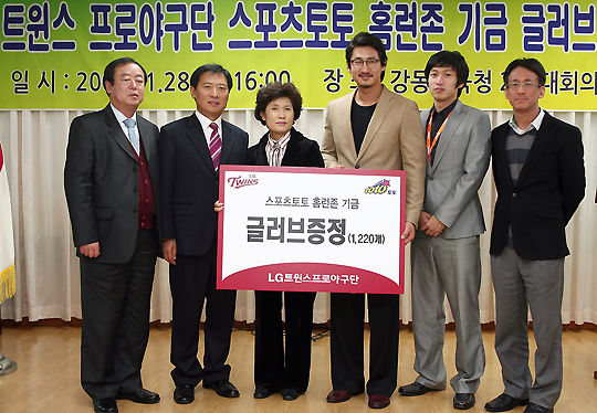 2008시즌 LG트윈스와 스포츠토토가 함께 운영했던 '스포츠토토 홈런존' 적립기금 전달식이 28일 오후4시 강동교육청에서 있었다. '스포츠토토 홈런존'은 잠실구장 왼쪽 외야팬스에 설치되어 홈런이 넘어 갈때마다 100만원씩 적립되었으며 이번에 강동교육청 관내 초등학교 61개교에 야구글러브를 학교당 20개씩 총 1,220개를 구입해서 전달 했다. 전달된 야구글러브는 야구선수가 아닌 초등학교 학생들이 체육시간에 야구를 즐길수 있게 할 예정이다. LG트윈스 박용택선수가 강동교육청 홍성남 학무국장 및 관계자들에게 전달 했다. [사진-LG 제공]