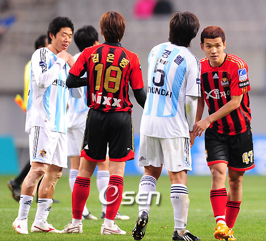 '삼성 하우젠K리그 2008' 플레이오프 FC 서울과 울산 현대의 경기가 30일 서울월드컵경기장에서 벌어져 연장전에 4골을 주고받는 열띤 경기끝에 서울이 4-2로 승리를 거두어 챔피언결정전에 진출했다. 경기를 마치고 이긴 서울의 김은중 김승용이 패한 울산 현영민 유경렬과 위로와 격려의 인사를 나누고 있다./상암=손용호 기자spjj@osen.co.kr