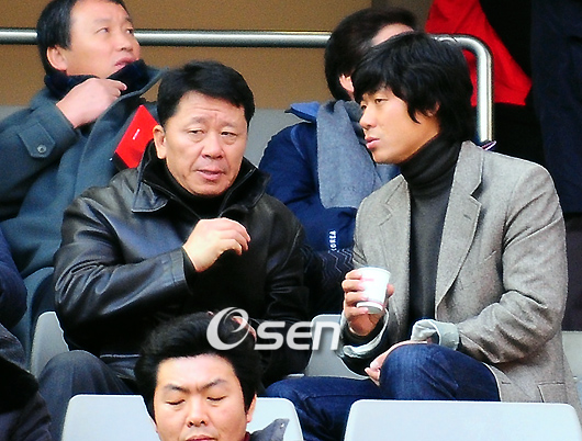'삼성 하우젠K리그 2008' 플레이오프 FC 서울과 울산 현대의 경기가 30일 서울월드컵경기장에서 벌어져 연장전에 4골을 주고받는 열띤 경기끝에 서울이 4-2로 승리를 거두어 챔피언결정전에 진출했다. J리그 사간 도스의 코치로 활약 중인 윤정환이 경기장을 찾아 정해성 국가대표팀 수석코치와 얘기를 나누고 있다./상암=손용호 기자spjj@osen.co.kr