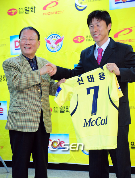 '학범슨' 김학범 감독의 사퇴 후 선장을 잃었던 성남 일화가 '신태용 호'로 새롭게 닻을 올렸다. 성남 일화는 1일 신태용(37) 감독 대행을 임명하고 공식 기자회견을 실시했다. 신태용 신임 감독대행은 꾸벅 인사를 한 뒤 "이 자리에 앉아서 취재진에게 이야기를 하기 어렵다"면서 "성남을 맡아 잘 이끌고 있을까하는 불안감이 더 크다. 모든 구단 관계자들의 믿음으로 이 자리에 앉게 됐다. 다시 성남이 내가 선수생활에 얻었던 영광을 지도자로서 세우고 싶다. 너무 흥분되어 말하기 힘들다"고 소감을 밝혔다. 신임 신태용 감독대행은 지난 1992년 부터 2004년까지 성남에서 선수생활을 하며 99골과 68개의 어시스트를 기록했다. 도움 2개가 모자라 아쉽게 '70-70 클럽'에 이름을 올리지 못했지만 K리그 유일의 '60-60 클럽' 멤버이자 401경기 출전으로 김병지, 김기동의 뒤를 이어 K리그 역대 출전 횟수 3위를 기록하고 있다. 1996년에는 미드필더로서 득점왕 자리를 차지했고 지난 2003년 7월 27일 대전과의 경기에서는 골을 넣은 뒤 교체 3명을 모두 쓴 상황에서 주전 골키퍼 김해운이 부상을 당하자 골문을 지켜 한 경기에서 득점과 실점을 모두 기록하는 진기록을 쓰기도 했다. 특히 신태용 감독은 다음 시즌에 대한 목표에 대해 당차게 말했다. 성남 전성기 시절의 선수로서 최고의 영광을 누렸던 것에 대해 다시 재현하겠다는 욕심을 나타낸 것. 신 감독대행은 "프로에서 2등은 필요없다. 감히 내년에 우승에 도전하겠다"고 말했다. 또 팬들에 대한 사랑에 대해서도 똑부러지게 의견을 표출했다. 신 감독대행은 "관중없는 우승팀은 필요없다. 팬 없는 축구선수는 소용없다"면서 "많이 찾아 주시면 팬들에게 좋은 경기로 보답하겠다"고 말했다. 하지만 이날 기자회견서 가장 큰 관심을 받은 것은 감독대행의 꼬리표를 떼지 못한 부분이었다. 이와 관련해 박규남 사장은 전혀 문제 없음을 확언했다. 박규남 사장은 "13년간 전설적인 실적을 성남에서 만들어 낸 장본인이다"며 "선수로서는 전혀 손색이 없다. 대행이라는 이름을 떼기 위해 노력할 수 있도록 노력하라는 격려의 의미이다"고 말했다. 한편 박규남 사장은 피스컵과 관련해 "피스컵에 참여할 수 있는 혜택은 충분하다"며 "나의 개인적은 욕심은 올해 성남이 성적을 내지 못했다고 하더라도 호스트로서 참가할 수 있었으면 좋겠다"고 대답했다. 10bird@osen.co.kr
