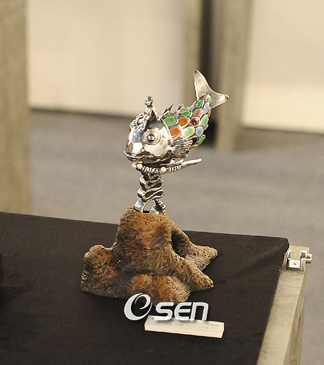 한국 공예의 현재와 미래를 볼 수 있는 ‘2008 공예트렌드페어’가 서울 강남구 삼성동 코엑스 태평양홀에서 3일부터 5일간 ‘꿈과 실용의 향연’에 들어갔다. 3회째 맞는 올해는 관람객의 적극적인 참여를 유도하기 위해 입장료 5000원을 내면 전시관에서 사용할 수 있는 5000원짜리 상품권으로 되돌려 준다. '2008 아트클레이 실버 콘테스트'에서 재단법인 일본 여가문화진흥회 회장상을 받은 최원정 씨의 작품이 신소재인 순은 점토를 이용한 공예 '아트 클레이' 부스에 전시되고 있다. /강희수 기자 100c@osen.co.kr [내 손안의 스포츠신문 OSEN 펀펀]