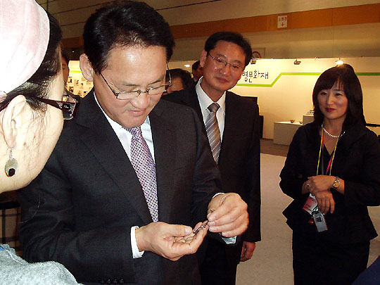 한국 공예의 현재와 미래를 볼 수 있는 ‘2008 공예트렌드페어’가 서울 강남구 삼성동 코엑스 태평양홀에서 3일부터 5일간 ‘꿈과 실용의 향연’에 들어갔다. 3회째 맞는 올해는 관람객의 적극적인 참여를 유도하기 위해 입장료 5000원을 내면 전시관에서 사용할 수 있는 5000원짜리 상품권으로 되돌려 준다. 유인촌 문화체육관광부 장관이 3일 오후 코엑스 현장을 찾아 전시관을 둘러보고 있다. /한국공예문화진흥원 제공. 온라인으로 받아보는 스포츠 신문, 디지털 무가지 OSEN Fun&Fun, 매일 3판 발행