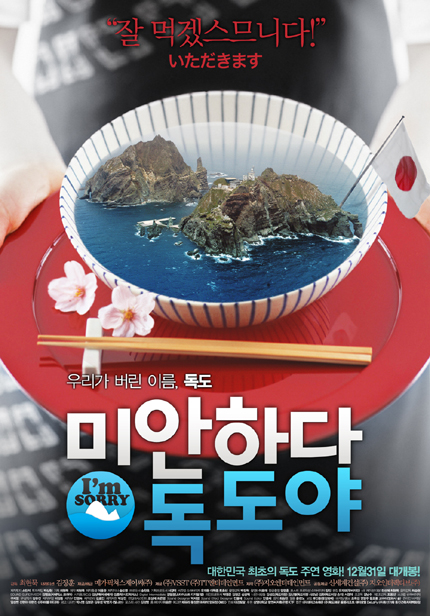 대한민국 최초의 독도 주연 영화 ‘미안하다 독도야’가 충격적인 포스터를 공개했다. ‘미안하다 독도야’는 그 타이틀만큼이나 포스터도 예사롭지 않다. 우리의 소중한 영토인 독도에 일장기가 보란 듯이 꽂혀 있다. 게다가 일본의 대표 음식인 우동 그릇 안에 쏙 담겨있기 까지 하다. 거기에 덧붙여 “잘 먹겠스므니다”라는 헤드라인은 충격적이기까지 하다 ‘미안하다 독도야’ 제작진은 보도자료를 통해 “포스터는 보이는 것 이상의 의미를 내포하고 있다”며 “대한민국의 영토인 독도를 자신들의 영토라고 주장하는 일본의 도발은 어제 오늘의 이야기가 아니다. 일본이 독도를 자신의 영토라 주장해올 때마다 우리 모두는 한 마음이 되어 분노하며 ‘독도는 우리땅’이라고 부르짖었으나 이러한 상황이 잠잠해지면 이내 독도를 잊어버렸던 것도 사실이다”고 밝혔다. 또한 “일본의 대표적인 음식인 우동 그릇에 담긴 독도, 그리고 그것을 ‘잘 먹겠다’라는 말 한마디로 독도를 삼키려는 일본의 모습을 포스터에 담음으로써 일본에 대한 경고의 의미와 함께 우리 스스로에 대한 반성을 담았다. 이 영화는 독도 사랑이 어제 오늘 한시적으로 하는 것이 아닌 우리가 앞으로 꾸준히 해나가야 할 과제임을 이야기 하고자 한다”고 덧붙였다. 12월31일 개봉하는 ‘미안하다 독도야’(최현묵 감독)는 2007년 여름부터 2008년 겨울까지 무려 17개월 간의 준비를 거쳤다. ‘미안하다 독도야’는 대한민국 최초의 독도 다큐멘터리 영화다. 김장훈이 특유의 서민적이고 진솔한 목소리로 내레이션을 맡았다. 그 동안 숱한 우여곡절 속에서도 꿋꿋이 촬영을 마쳤던 ‘미안하다 독도야’는 독도에 홀로 살고 있는 김성도 할아버지 부부와 손자 가족의 이야기를 비롯해서 사이버 외교를 펼치는 민간단체 반크(VANK)의 이야기를 담는다. 독도를 해외에 알리려 영어학원에 다니는 80대 할아버지에서 세계 여러 나라 사람들과의 펜팔을 통해 독도를 알리는 초등학교 여학생까지 꾸준히 독도를 사랑으로 지켜온 평범한 사람들의 모습이 이어진다. crystal@osen.co.kr 온라인으로 받아보는 스포츠 신문, 디지털 무가지 OSEN Fun&Fun, 매일 3판 발행