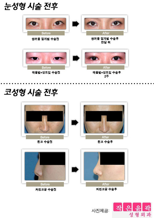 미의 기준은 분명 지역마다 틀리며 시대를 지나오면서 변화해 오고 있다. 동양인의 얼굴은 대체적으로 코는 뭉뚝하며 외꺼풀을 가진 얇고 긴 눈이라 할 수 있다. 최근 개봉되어 인기를 끌고 있는 영화 ‘미인도’에서 신윤복의 미인도는 조선후기의 미인상을 보여주고 있다. 쌍꺼풀이 없는 가는 눈과 좁고 긴 코, 입은 작고,턱이 짧은 형태를 띄고 있다. 시대를 지나오면서 미인상은 서서히 바뀌어 눈은 커지고 코와 턱은 상대적으로 길어진 형태를 띄고 있다. 바로 서구형의 얼굴이라 할 수 있는데 세련되면서 어려 보이는 인상이다. 성형수술에 있어 가장 선호하는 부위는 눈과 코라고 할 수 있겠다. 눈과 코는 얼굴의 중심부에 위치하여 전체적인 인상을 크게 좌우하고 약간의 변화에도 예뻐질 수 있기 때문이다. 눈 성형 방법으로는 매몰법, 절개법, 부분절개법(최소절개법)과 앞트임, 뒷트임 등이 있다. 각자 개인이 가지고 있는 눈의 형태와 조화를 따져 알맞은 눈 성형방법을 선택하여야 한다. 최소절개 Dynamic 쌍꺼풀 수술법의 경우 최소 절개인 1~1.5cm 절개로 졸린 눈을 붓기가 거의 없이 3~4일만에 큰 눈매와 시원한 쌍꺼풀로 만들고, 피부가 얇은 쌍꺼풀의 경우, (특히 중고등학생이나 대학생) 시술시간이 10분 정도되는 퀵쌍꺼풀을 만들고, 눈에 지방이 많고 두툼한 눈은 눈 위지방만 단순하게 빼면 교정은 되지만 쌍꺼풀과 눈썹 사이의 두툼한 눈은 교정이 안되므로 그 부분을 교정시켜 주는 방법으로 눈 모양에 따라 수술방법을 달리하여야 자연스러운 쌍꺼풀을 완성시킬 수 있다. 대부분은 심미적인 이유로 쌍꺼풀수술을 하지만 생활에 불편함을 느끼고 눈 성형을 선택해야 하는 경우도 있다. 나이가 들면서 눈썹이 처지고 눈꺼풀이 내려와 심각할 경우 눈을 덮어 시야를 가리게 되는 결과를 가져올 수 있다. 이러한 경우 단순한 쌍꺼풀 수술만으로 확 트인 시야확보를 교정할 수 없기 때문에 눈썹 바로 아래 부분을 절개하거나 지방이식을 통해 상안검거상술 또는 상안검성형(눈처짐교정수술)으로 처진 눈꺼풀을 개선하고 눈매를 올려주어야 한다. 눈 성형이 많이 보편화된 성형수술이라고 해서 너무 쉽게 생각하면 오산이다. 쌍꺼풀은 수술 전에 피부상태나 주변 근육, 지방 등을 제대로 파악한 후 수술하지 않으면 눈이 잘 안 떠지거나 쌍꺼풀이 제대로 잡히지 않는 등의 부작용이 나타날 수 있기 때문이다. 이러한 부작용의 피해로 요즘은 쌍꺼풀 재수술의 수요도 많아지고 있는 실정이다. 코 성형의 경우에도 심미적인 성형과 기능적인 문제로 성형을 선택하는 경우로 나뉘어 볼 수 있다. 심미적인 코 성형은 본인이 콤플렉스를 가지고 있는 경우가 대부분 인데 동양인의 코는 약간 뭉툭하면서 낮기 때문에 콧대와 코끝 성형수술을 많이 하게 된다. 구체적으로 낮은 코, 뭉뚝한 코, 넓은 코, 매부리 코, 휜 코, 들창코, 화살 코 인 경우이다. 콧대를 세울 때는 본인의 상태에 따라서 보형물의 종류가 달라지게 된다. 보형물은 실리콘이나 코어텍스 등이 있다. 자가연골은 우선적으로 비중격연골을 이용하며 연골의 양이 적거나 질이 좋지 않은 경우 귀연골을 함께 이용하여 코끝성형을 하게 된다. 짧은 코수술이나 코재수술을 위해서는 가슴연골을 이용하는 경우로 자가근막을 함께 채취하여 가슴연골을 자가근막으로 감싸 콧등에 삽입함으로써 수술 후 라인이 아름다운 콧등을 만든다. 코끝은 올리기만 하는 것이 아니라 입체적으로 아름다운 코끝을 만들기 위해 자가연골을 이용하여 코끝의 뼈대를 새로 만들어 주어 부작용 없이 오랫동안 자연스럽고 입체적인 코끝을 성형한다. 요즘에는 티 안 나는 자연스러운 성형을 사람들이 원하고 있다. 각자 생김새가 다르고 그에 따라 어울리는 코 모양도 틀리기 때문이다. 콧대나 코끝만 올리는 단순한 시술이 아니라 어떤 방향에서 바라봐도 예쁜 각이 나오며 세련된 코 모양을 만드는 코 성형을 3차원 코 성형술이라 한다. 코 구멍 모양, 코끝과 콧날개, 코 기둥 등의 여러 가지 복합적인 상관관계와 모양을 고려하여 가장 이상적이고 예쁜 코를 만드는 성형 방법이라 하겠다. 기능적인 코 성형의 가장 대표적인 증상은 코 막힘이다. 해부학적인 구조물의 변형으로 공기의 흐름이 원활하지 않아 생기게 된다. 전문의들은 코 막힘으로 생활에 불편을 초래한적이 있다면 코 성형을 받기 전에 콧속에 코 막힘을 일으키는 문제가 있는지 반드시 검사해볼 것을 권장하고 있다. 외부적으로 아름다운 코 모양을 얻더라도 평생 숨쉬기가 불편하다면 코 성형에 대한 만족도가 떨어질 것이 분명하기 때문이다. 이처럼 비중격만곡증이 있는 환자가 코 성형을 받을 때에 휘어진 비중격을 재건하는 중격성형술을 함께 시행하는 것이 좋다고 할 수 있다. 그러나 일반적인 성형외과는 코막힘증상과 같은 기능적인 문제는 이비인후과의 영역이기 때문에 코 성형과 동시에 해결을 할 수 없어 이비인후과 진료와 병행해야 한다. 그러나 청담동의 작은윤곽성형외과의 경우는 이비인후과 의료진의 참여로 위와 같은 문제를 한꺼번에 해결할 수 있는 장점 때문에 많은 환자들이 찾고 있다고 병원 
