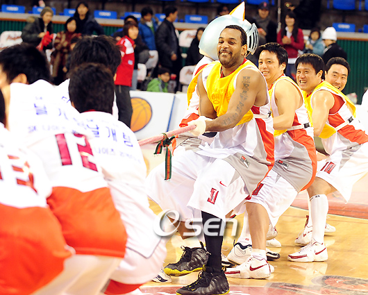 '2008-2009 동부 프로미 프로농구' 서울 SK 와 부산 KTF의 경기가 6일 잠실학생체육관에서 벌어져 SK가 주전의 고른 활약으로 88-66으로 승리를 거두었다. 경기 후 SK 선수들이 팬서비스로 두 팀으로 나뉘어 줄다리기를 하고 있다./잠실학생체=손용호 기자spjj@osen.co.kr 온라인으로 받아보는 스포츠 신문, 디지털 무가지 OSEN Fun&Fun, 매일 3판 발행